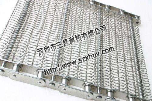 10.鏈條式網(wǎng)帶:由鏈條驅(qū)動的輸送網(wǎng)帶一般都由鏈條帶動小軸再帶動網(wǎng)帶運行。 網(wǎng)帶都采用軋牙串條、左右網(wǎng)條二根串,并大小網(wǎng)條連接而成,大網(wǎng)條內(nèi)穿進(jìn)小軸,小軸二端穿入鏈條孔,從而達(dá)到鏈條驅(qū)動輸送網(wǎng)帶。鏈條網(wǎng)傳動平穩(wěn)、傳動力矩小。11,U型鏈條網(wǎng)帶,也可作為螺旋式網(wǎng)帶,采用進(jìn)口電腦網(wǎng)帶機生產(chǎn),網(wǎng)面強硬耐用,不易變形。最大特點是轉(zhuǎn)彎性能好,可以實現(xiàn)180度的轉(zhuǎn)彎,且運行平穩(wěn)。具有網(wǎng)面平整,可承載較重的壓力和拉力。通風(fēng)透氣性能好,網(wǎng)面潔凈無毒,而且容易清洗。維修和拆卸極為方便。可根據(jù)客戶要求在網(wǎng)帶兩側(cè)加裝擋邊。