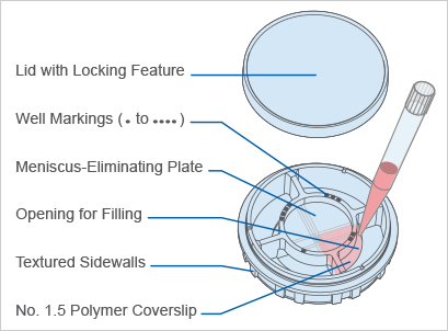 中心,有間隔的培養皿減少了彎液面的形成,使得相差光學明顯。與此同時,Ph+的特性促使了細胞均一性分布。