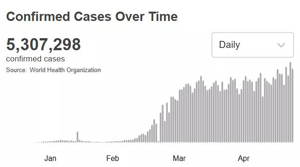根據(jù)世衛(wèi)組織最新實(shí)時統(tǒng)計數(shù)據(jù),截至北京時間5月26日0時42分,全球累計新冠肺炎確診病例5307298例,死亡病例342070例。